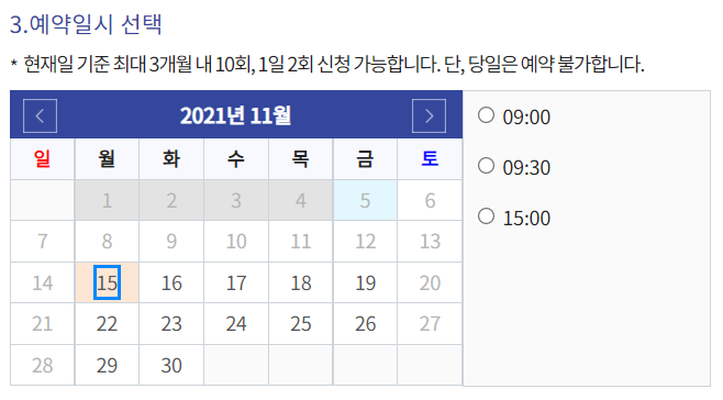 벌써 다음주는 꽉 찼네요. 제일 빠른 날짜인 15일을 눌러보니 3개의 시간밖에 없습니다. 나머지 시간은 다 찼나봐요..