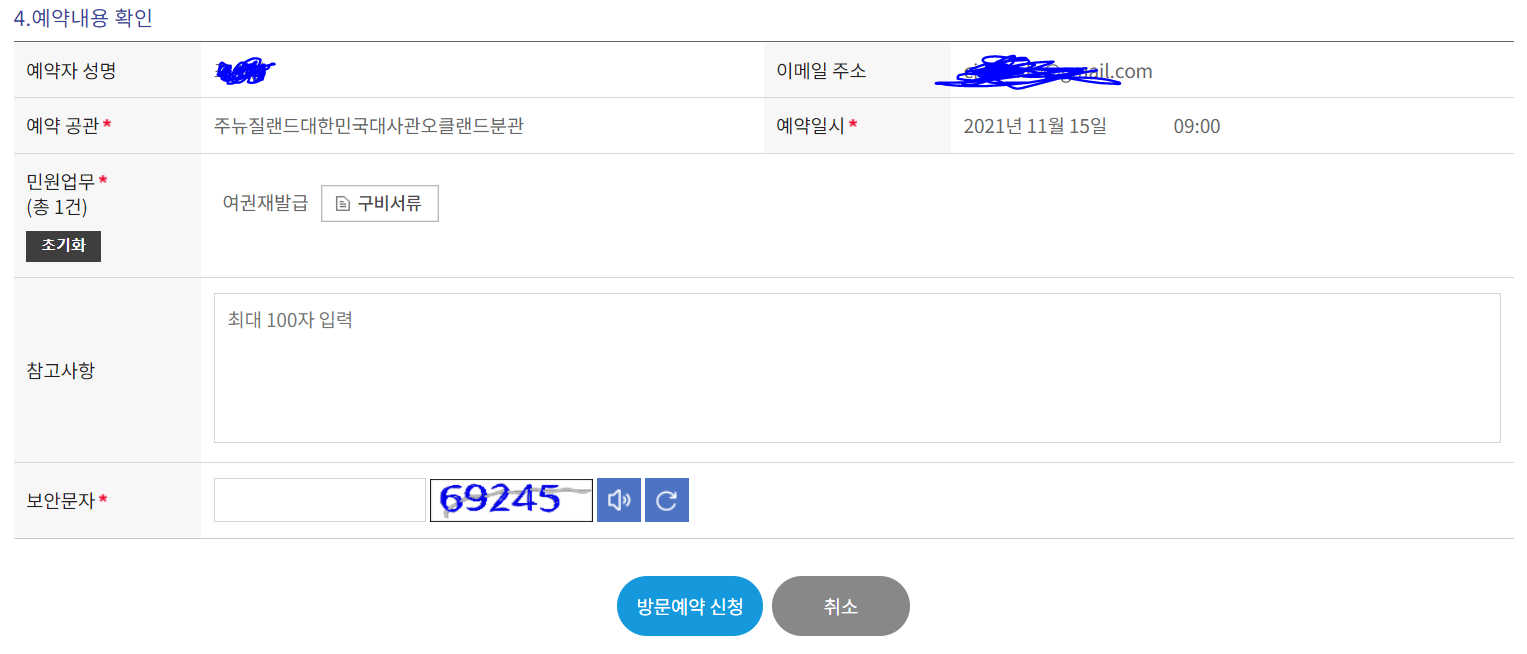 시간까지 선택을 마치면 아래쪽에 이름, 이메일주소, 예약공관, 예약일시, 민원업무가 나옵니다.
