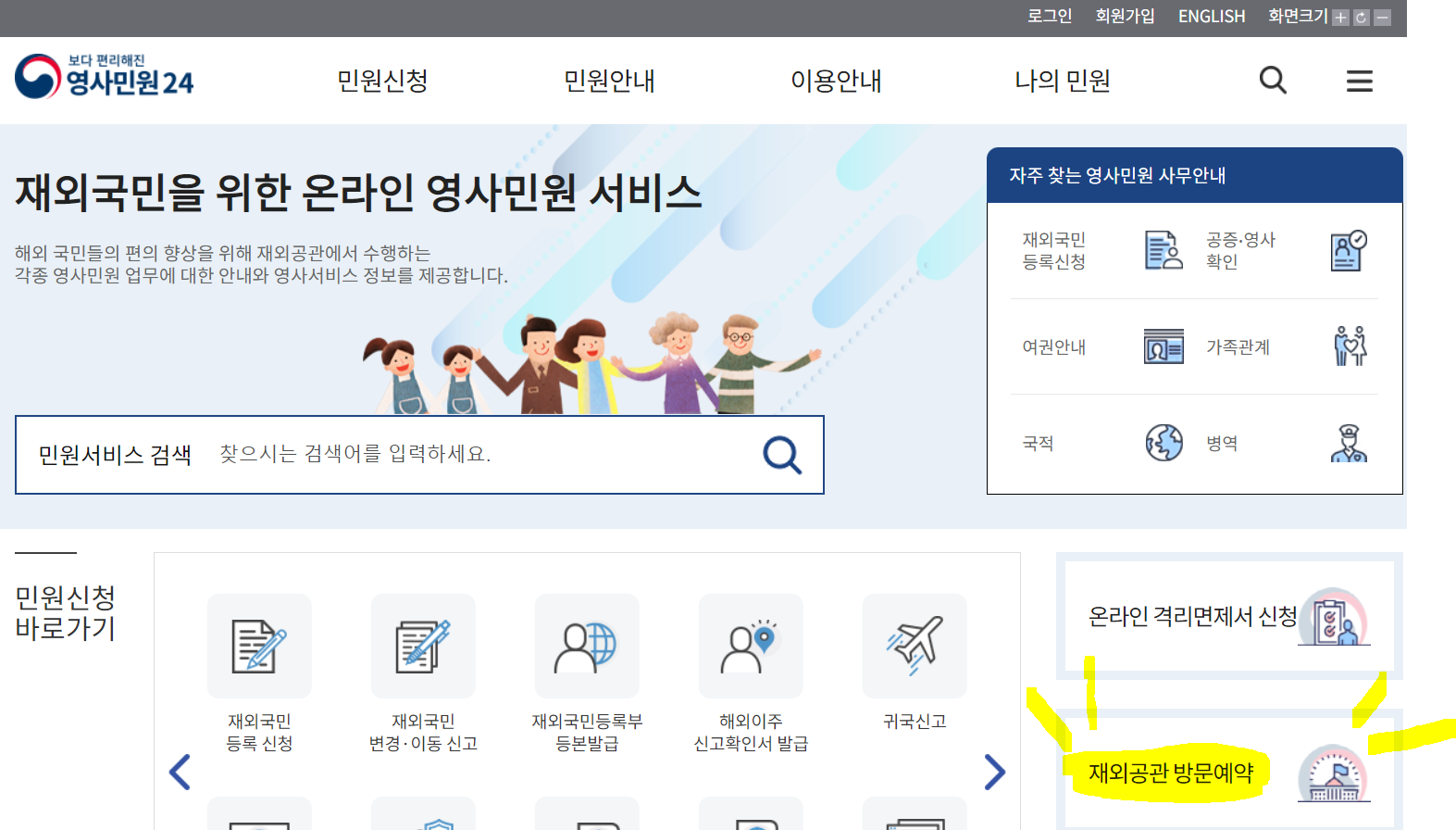 첫 페이지 오른쪽 아래에 바로 재외공관 방문예약이 보이죠? 클릭하세요!