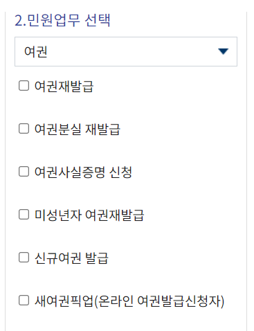저는 우선 카테고리에서 여권을 선택하였고, 하위 카테고리에서는 여권재발급을 눌렀어요.