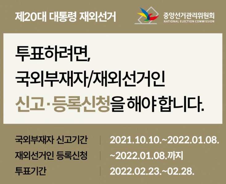 국외부재자는 지난번 대선/국회의원 선거 때 등록을 했더라도, 다시 한번 등록을 해야 합니다.
