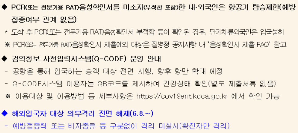 Q-CODE만 등록하고 비행기 탑승 전 코로나 검사만 하면 격리 의무가 없습니다.