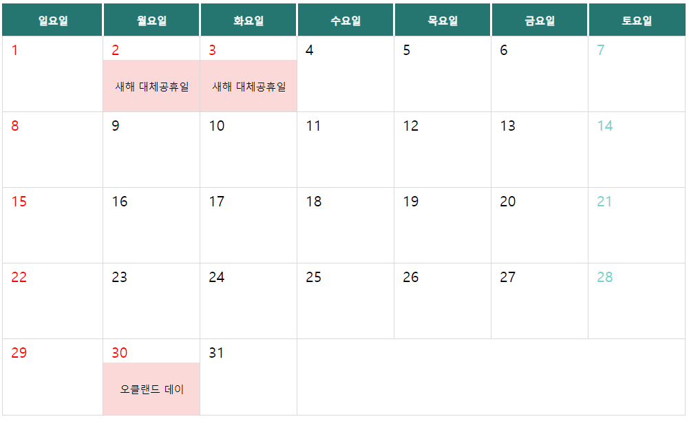 1월 : 2~3일(New Year), 30일(Auckland Day)
